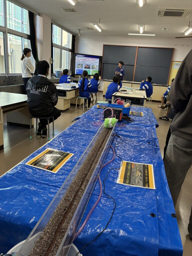 川の流れと地形形成の話題(久加15分)→ 常願寺川の治水と防災(立山砂防事務所さま)→ ミニ水路実験(蛇行と直線)を行いました。