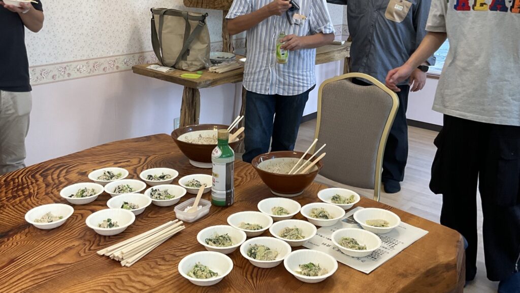 その後移動し,クルミを割って,野菜にからめるソースをつくり,試食会でした。