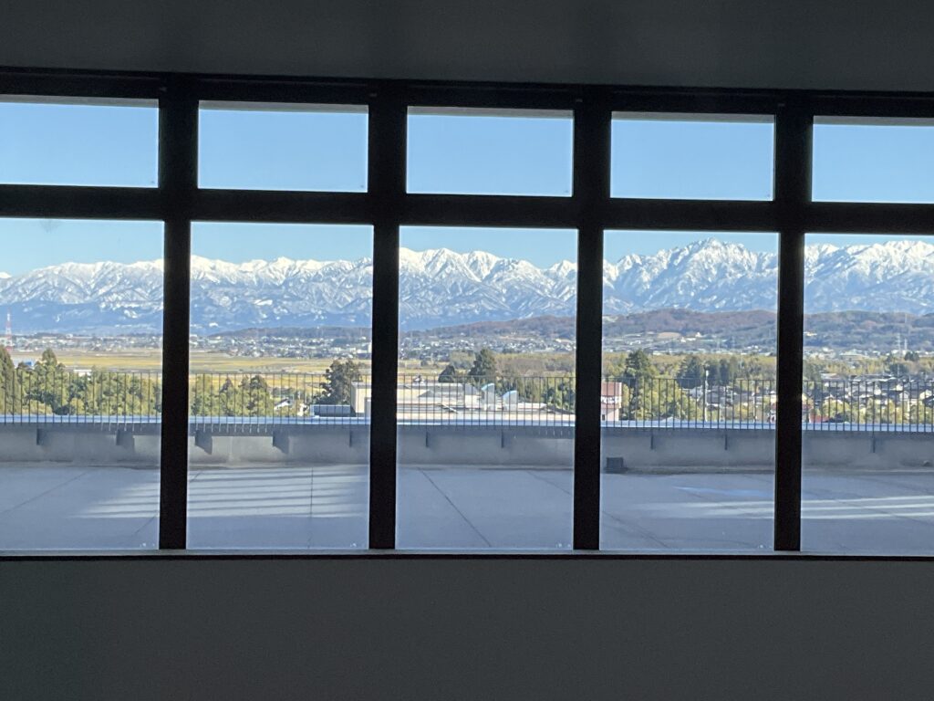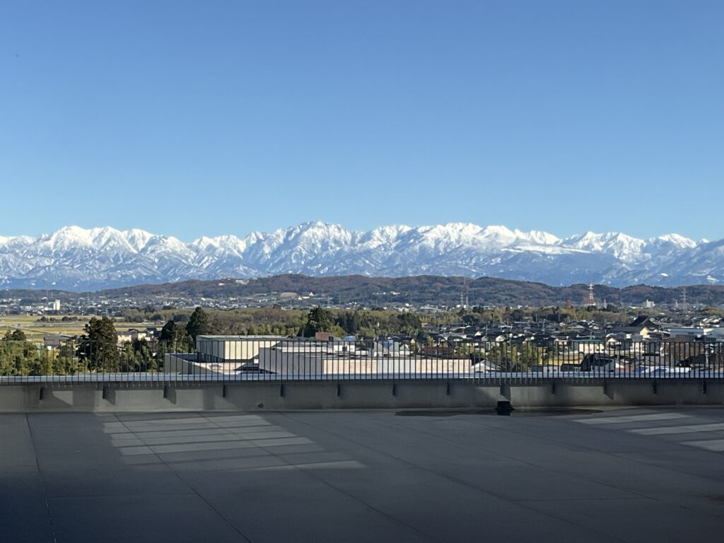 夏の間はぼんやりとしか見えない立山連峰ですが、冬が近づくにつれて、絶景の姿を現してくれます。気温が下がると富山湾からの水蒸気が減ることと、立山連峰に白い雪が積もることから反射することの2つの理由でしょうか。